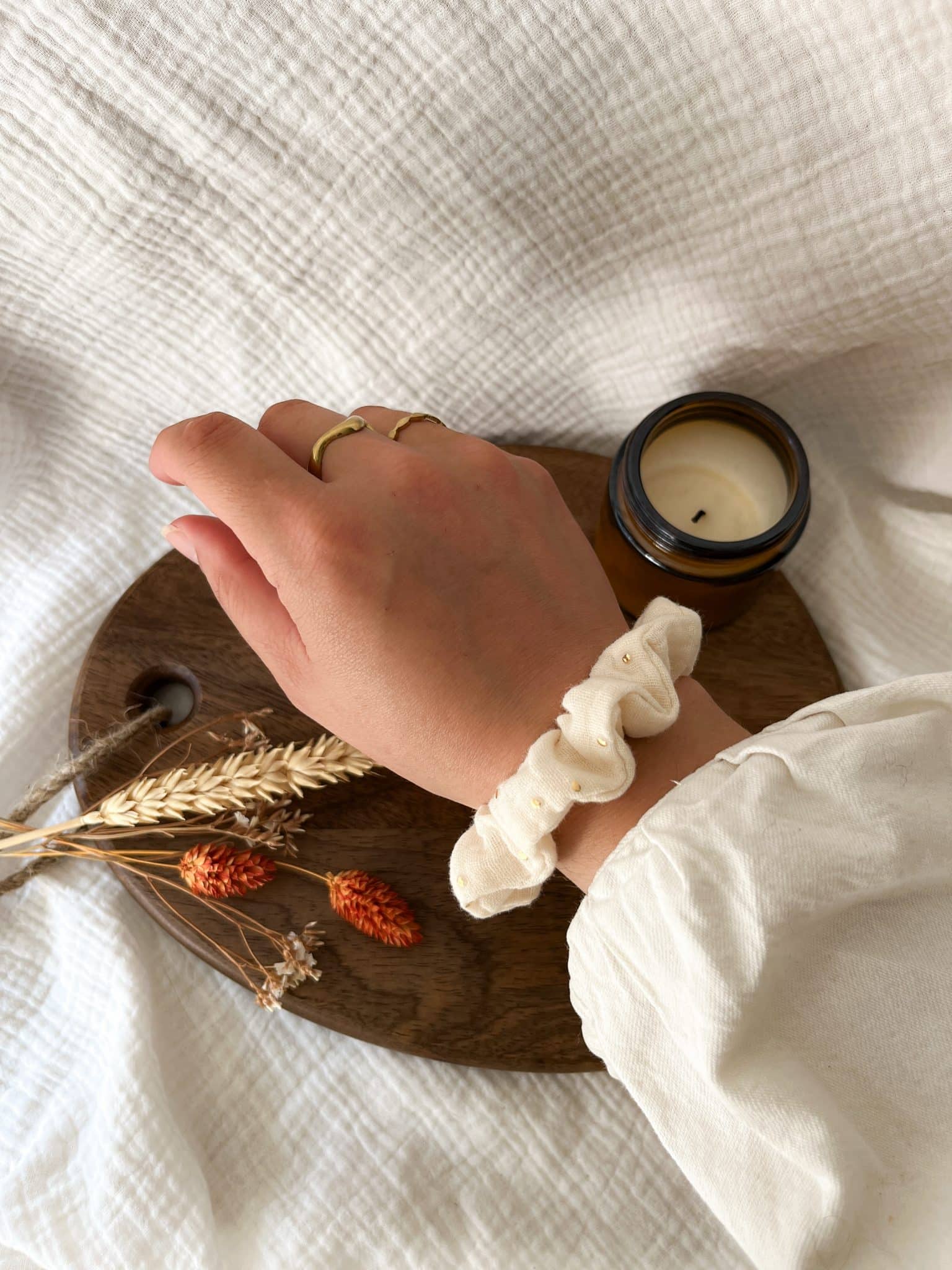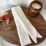 Foulard cousu à la main à Lille à partir de tissus de récupération, en gaze de coton blanc.