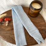 Foulard cousu à la main à Lille à partir de tissus de récupération, en gaze de coton bleu clair.