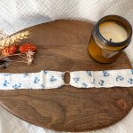 Cette manchette en gaze de coton blanc à fleurs bleus, avec son anneau doré en zamac, se noue facilement autour du poignet grâce à un double nœud.
